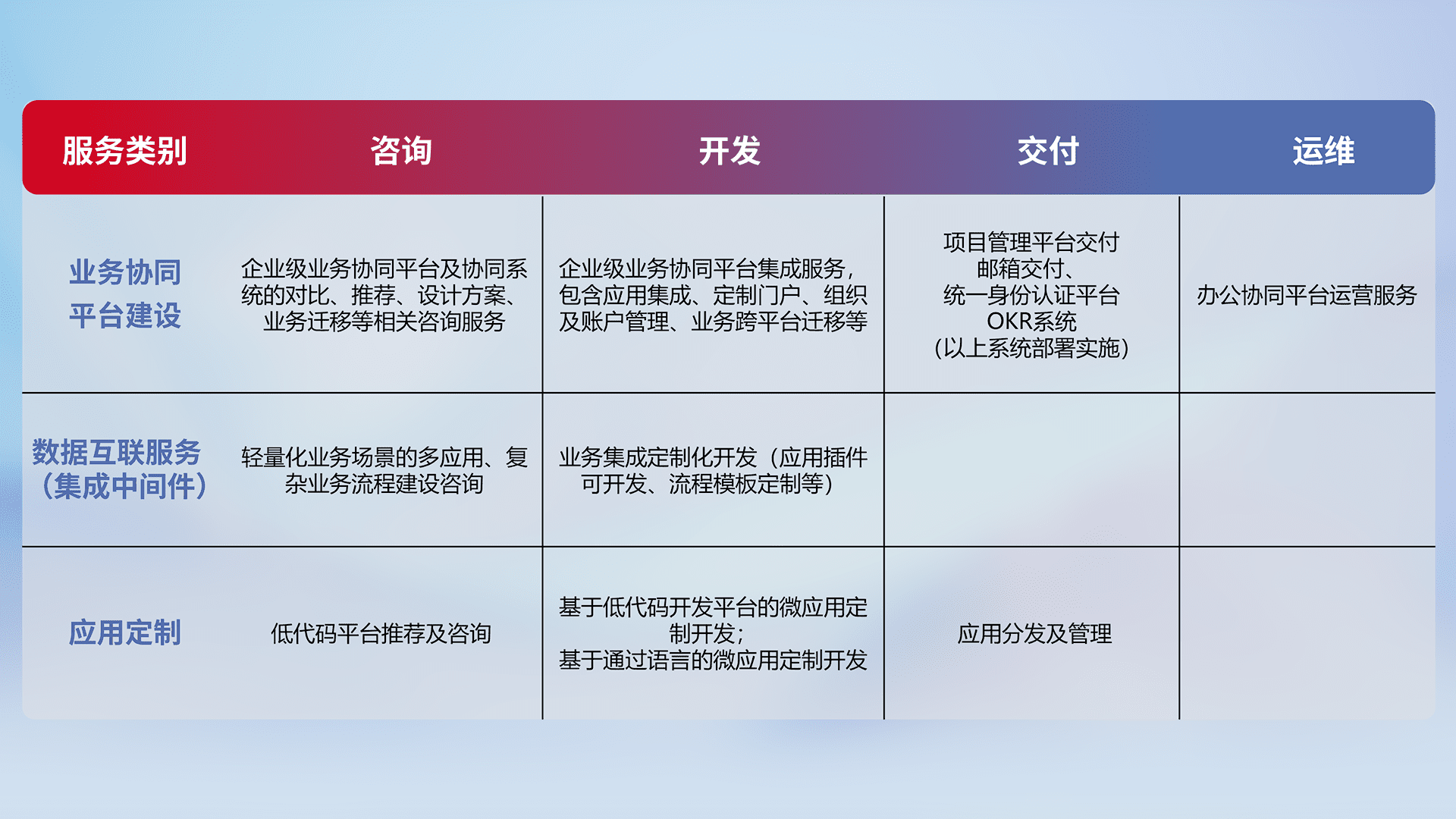 针对钉钉、、、、企微、、、、IDaas等平台级产品提供产品的规划、、方案、、交付、、定制化开发等服务,,,,实现如统一协同办公、、、、智能客户服务、、混合会议管理、、、智能数据查询、、等业务场景,,,实现数字化转型。。。。